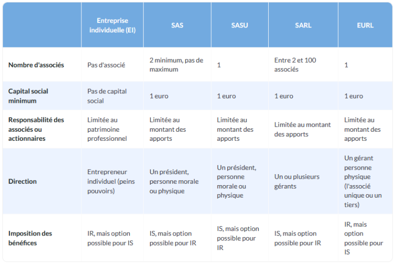 Tableau comparatif des différents statuts juridique